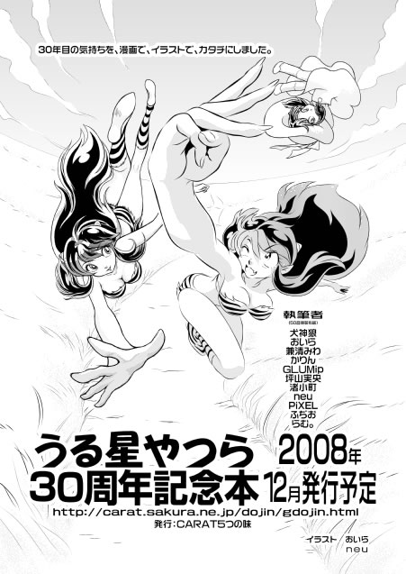 いつもご訪問感謝です。◆近況◆2008年12月発行『うる星30周年記念本』に参加。中表紙・漫画6P・漫画9Pを描きました。その他詳しくは発行元"CARAT5つの味"HPに情報あり。→http://carat.sakura.ne.jp/