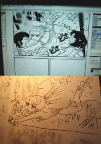 3P漫画完成、無事かりんさんの元に届いたようです! 今回は3度目の作成だったので、機能も以前よりスムーズに使うことが出来ましたが、なんせ持久力は乏しいし、書くスピードがすこぶる遅いので、結局おたおたしながら、普段の生活とうまく両立していけなくってバタバタしながら作りました。でも今までで1番満足出来たかな!?という部分はストーリーの流れです。原作やアニメのようにテンポよく場面やセリフが流れていく描き方にガンがリました。それでも立ち居ちの方向とか背景の向きの方向とかおかしい所があったりします。無念。。だいぶ進んでからじゃないと気付かないんですね~。なんでなんだろう。しかしまたいい経験させて頂きました。ありがとうございました。 |